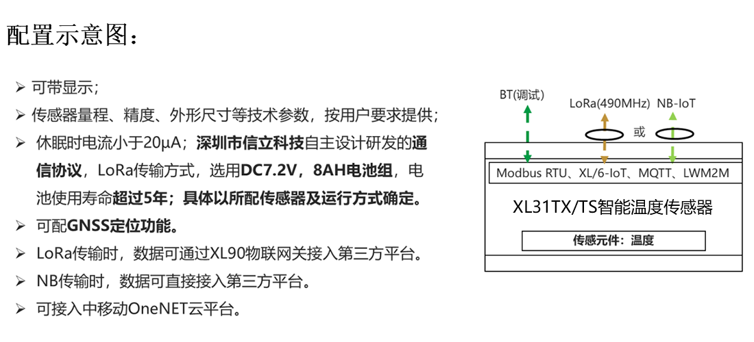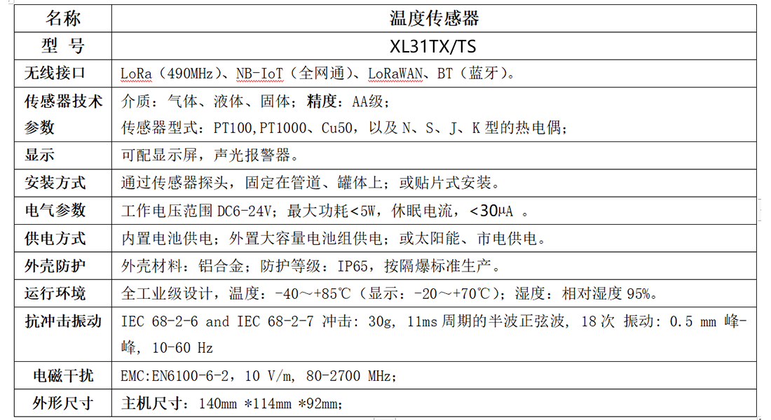 XL31TX/TS智能溫度傳感器,集成傳感元件、信息處理、無線通訊、電池供電等于一體。通訊中斷保存數(shù)據(jù),通訊恢復(fù)重傳數(shù)據(jù),超限主動(dòng)上傳數(shù)據(jù),電池能量低上傳報(bào)警數(shù)據(jù)。