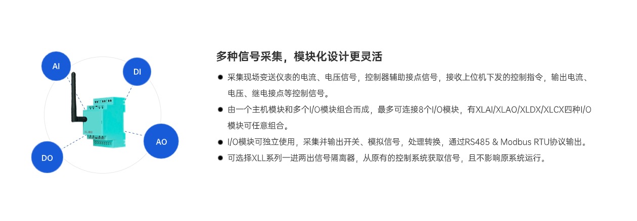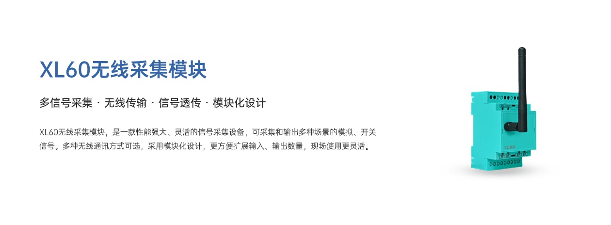 XL60無線采集模塊,采集模擬、開關(guān)信號,輸出模擬、開關(guān)信號,可選多種無線通訊方式。模塊化設(shè)計(jì),更方便擴(kuò)展輸入、輸出數(shù)量。