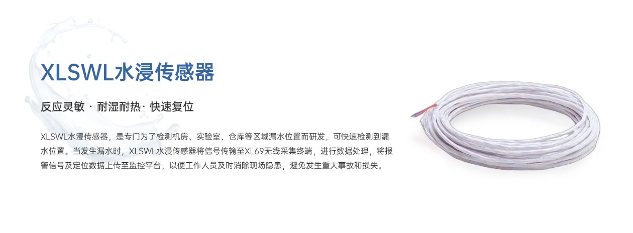 XLSWL水浸傳感器,是專門為了檢測機房、實驗室、倉庫等區域漏水位置而研發,可快速檢測到漏水位置。當發生漏水時,XLSWL水浸傳感器將信號傳輸至XL69無線采集終端,進行數據處理,將報警信號及定位數據上傳至監控平臺,以便工作人員及時消除現場隱患,避免發生重大事故和損失。