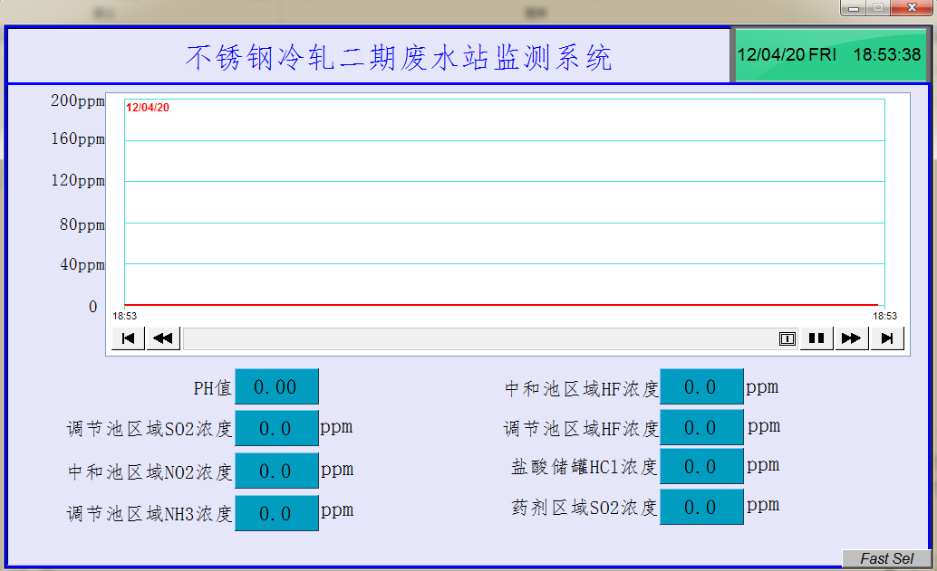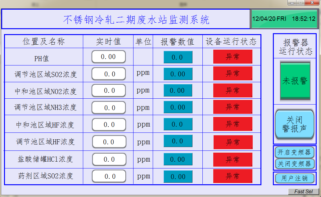 通過有線方式將現場的S02、N02、HCl、NH3、HF這5種氣體傳感器以及PH傳感器所采集的數據實時傳輸至值班室終端顯示屏,當氣體超限時自動打開變頻器,使風機運行。