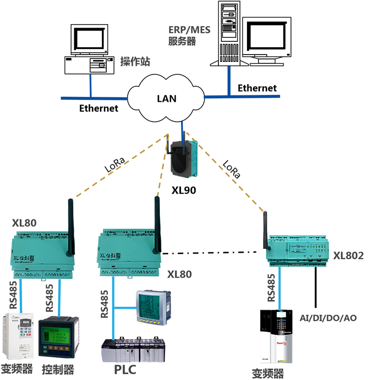 對采集點數據量小,需要Ethernet、RS485、CAN、USB 等通信接口讀取數據,要聯接多臺設備,選擇XL80智能主機,配置LoRa通信。