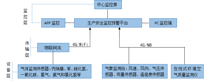 工業化工園區生產安全監控系統采用分層拓撲結構,分為設備采集層、傳輸層、監控層等。