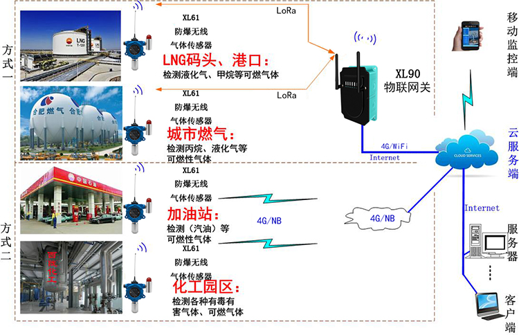 化工園區生產安全監控系統,基于無線傳感器、智能環境監測終端、物聯網關、無線采集裝置、監控服務器和XL.VIEW上位機監控軟件等,實現對園區生產環境的各項要素(如有毒有害氣體、易燃易爆氣體、風向風速、氣壓、雨量、溫濕度、粉塵、煙感等)進行實時采集、無線傳輸、監測與預警
