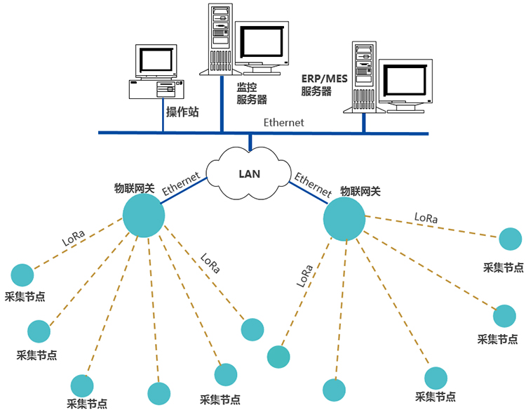 采集點裝置,通過LoRa無線通訊上傳數據至物聯網關,網關通過Ethernet或Wi-Fi,接入LAN,推送數據至企業生產管控服務器。