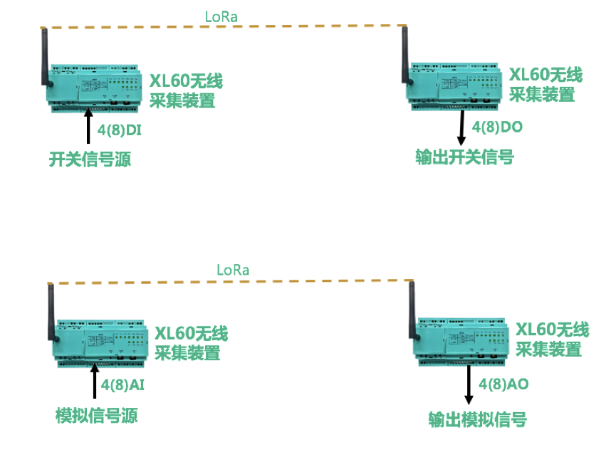 選擇兩臺XL60無線采集裝置,以一對一的無線傳輸方式,實現模擬、開關信號無線傳輸: