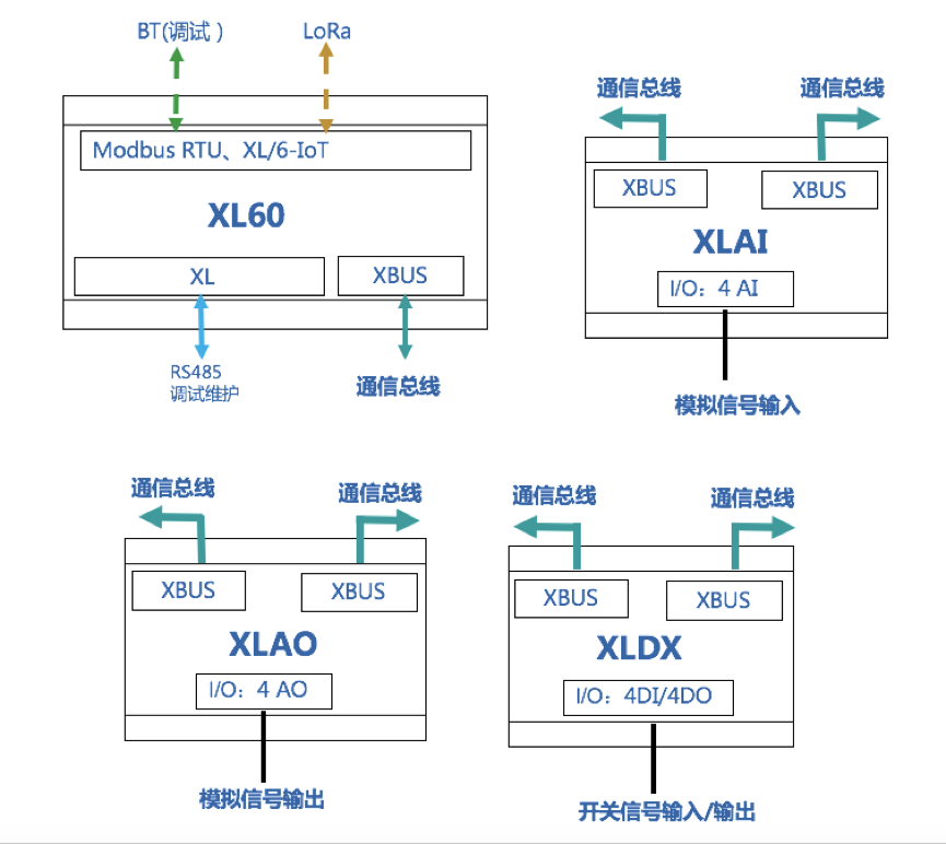 • I/O模塊可選:XLDX(4DI/0-4DO)、XLAI(0-4AI)、XLAO(0-4AO) 。