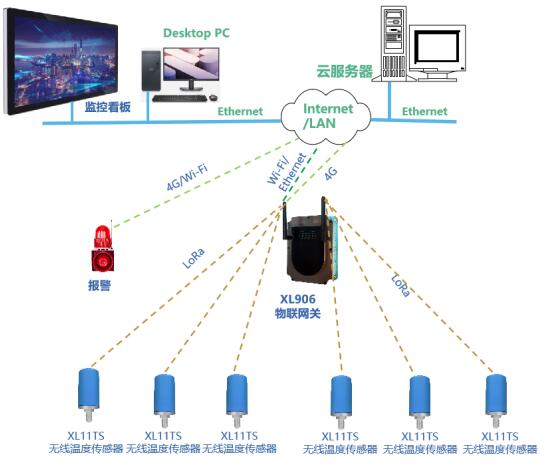 XL11TS無(wú)線(xiàn)溫度傳感器等采集節(jié)點(diǎn),通過(guò)LoRa無(wú)線(xiàn)傳輸技術(shù)將溫度數(shù)據(jù)傳輸至XL906網(wǎng)關(guān);