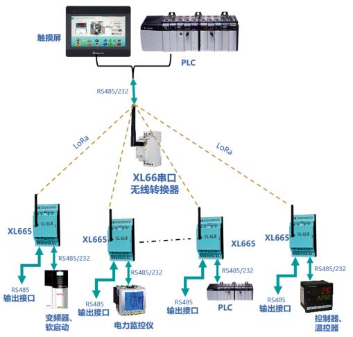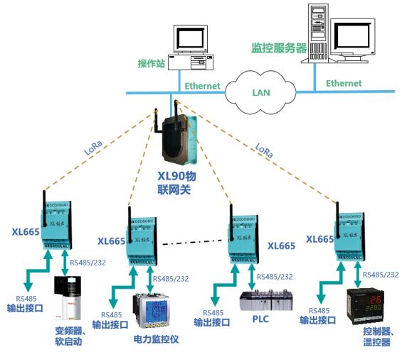 通過LoRa無線傳輸模塊輸出的數(shù)據(jù),可上傳至XL90物聯(lián)網(wǎng)關(guān)接入監(jiān)控軟件平臺(tái),或通過XL66串口無線轉(zhuǎn)換器,與PLC、觸摸屏等通信。