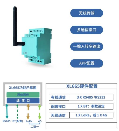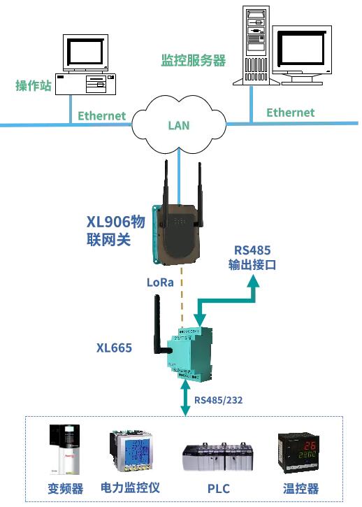 一路RS485信號,經由XL665無線轉換器,輸出一路RS485信號一路LoRa無線信號,同時接入兩個不同的設備(系統)。