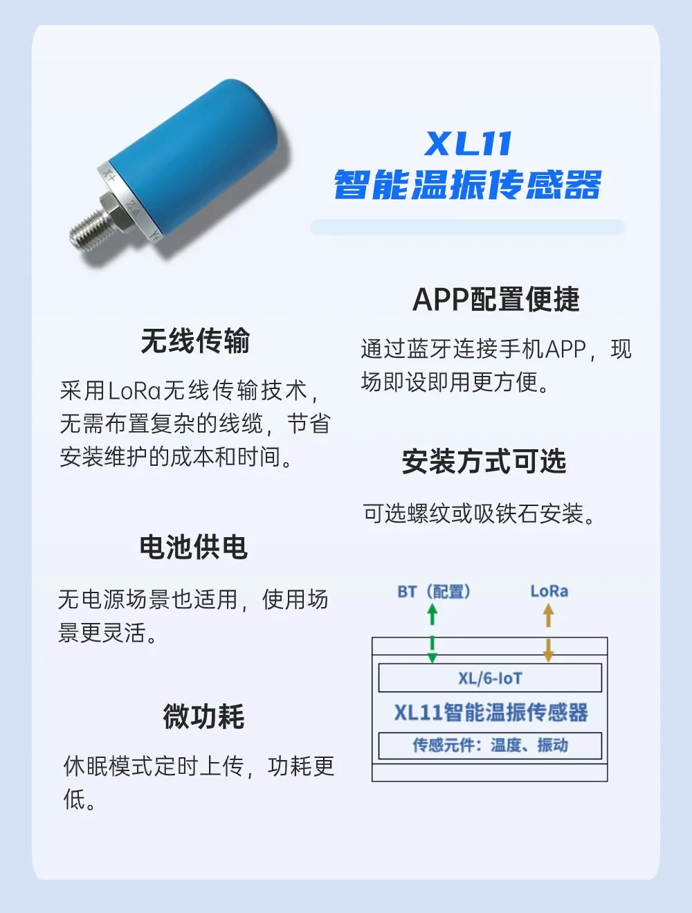 選擇XL11智能溫振傳感器,安裝在高爐、轉爐、連鑄機、熔煉爐等設備的電機和減速機上,實時采集溫度和XYZ三個方向的振動數據,為設備運行狀態的分析判斷提供數據支撐。