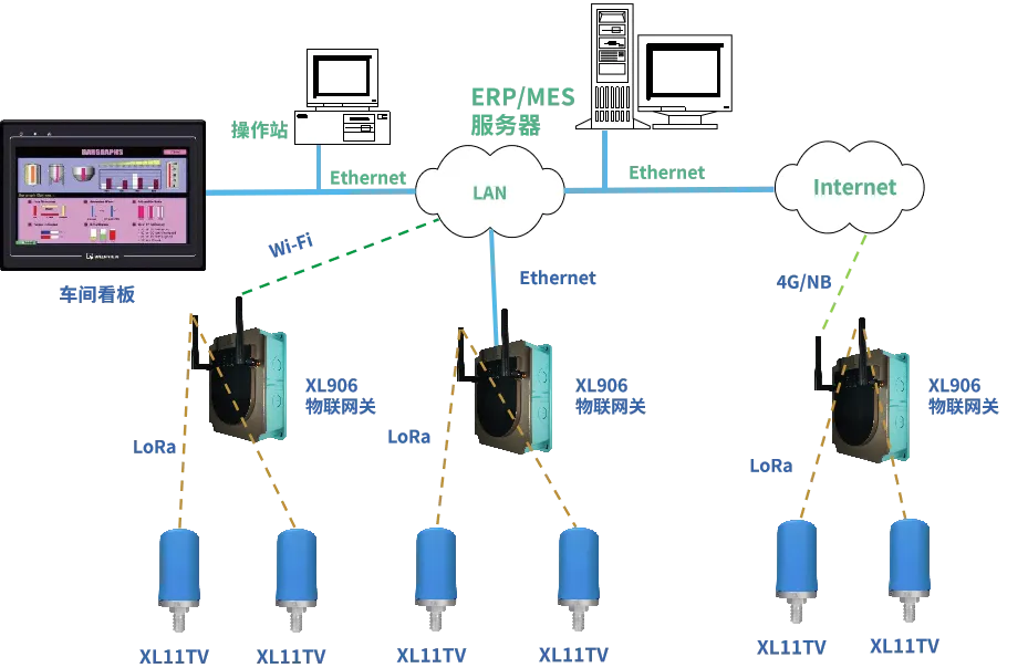 XL11智能溫振傳感器通過LoRa無線傳輸溫度和振動數據至XL906物聯網關,網關對數據進行處理、協議轉換,通過EthernetWi-Fi4G等通信方式,將數據上傳至監控中心或云平臺。