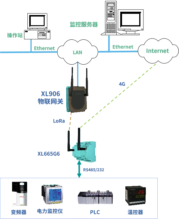 只配置有一個RS485通信口的設備,輸出的RS485信號接入XL665多路通信模塊,轉一路LoRa信號和一路4G信號輸出,同時接入現場控制中心和云平臺,實現設備數據同時接入兩個不同的管理平臺。