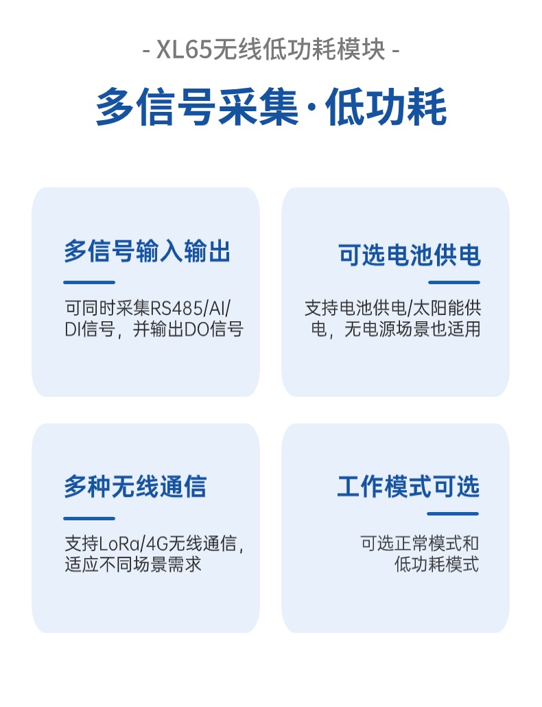 XL65無線低功耗模塊,集成RS485通信口和豐富的I/0口,可實現(xiàn)同時采集1路AI信號、3路DI信號、1路RS485信號,支持多種無線通信方式上傳采集的信號和數(shù)據(jù)。可選電池供電,適用于更多供電不便的場景。