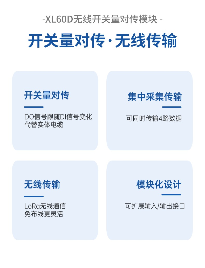 選擇XL60D無線開關量對傳模塊,接收控制儀表的開關量信號、輸出開關量信號控制生產(chǎn)設備啟停。