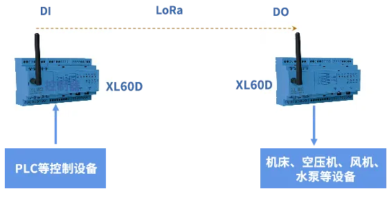 一對XL60D無線開關量對傳模塊,其中一臺與PLC等控制儀表連接,作信號發(fā)射端;一臺配置在生產(chǎn)現(xiàn)場,作信號接收端。發(fā)射端的XL60D將控制儀表的啟停命令,通過LoRa無線對傳到接收端,接收端的XL60D輸出開關量信號,控制設備啟、停。