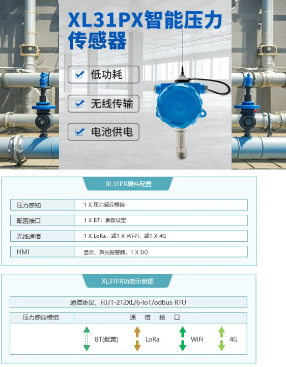 XL31PX智能壓力傳感器通過4G無線通信技術(shù),實(shí)現(xiàn)遠(yuǎn)距離、快速傳輸壓力數(shù)據(jù)至云平臺。