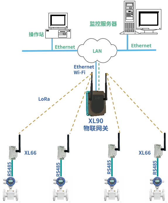 構建星型 LoRa 無線傳輸網絡,以XL90物聯網關為中心節點,多個XL6666作為終端節點分布在各個流量計安裝位置。XL6666 采集流量計數據后,通過 LoRa 無線傳輸數據給網關,網關通過Ethernet/WiFi將數據傳輸給中控室服務器。